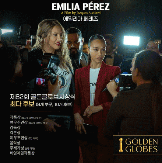 뮤지컬 코미디 영화 부문 작품상 및 여우주연상, 감독상, 각본상, 여우조연상, 음악상, 주제가상, 비영어권작품상에 후보로 이름을 올린 '에밀리아 페레즈'는 특히 여우조연상 부문에 조 샐다나와 셀레나 고메즈가, 주제가상에 2곡의 사운드트랙이 노미네이트되며 총 10개 후보 지명이라는 놀라운 기록을 세웠다.