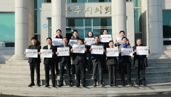 이날, 나주시의회 의원들은 의회 앞, 본회의장 등에서 윤석열 탄핵 및 국민의힘 해체 문구를 들고 강력하게 메시지를 발표했다.