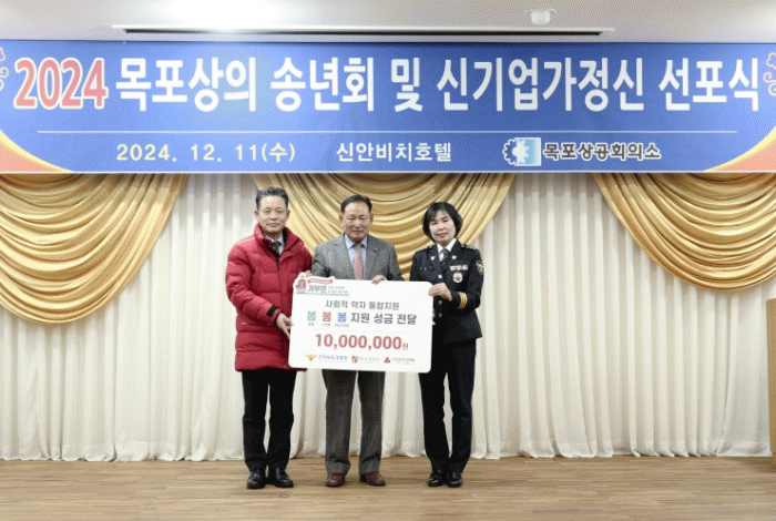 목포상의는 이날 신기업가정신 실천의 일환으로 ㈜대창식품(대표 정현택)이 전남경찰청 ‘봄봄봄 지원단’에 기금 1천만원을 전달했다고 밝혔다.