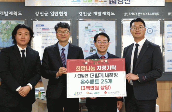 13일 강진군에 따르면 지난 12일 군수실에서 열린 희망2025나눔캠페인 기탁식에서 헤세드 미션콰이어와, 비영리법인 ‘더함께 새희망’이 함께 하며 어려운 이웃을 위한 나눔의 온정을 전했다.
