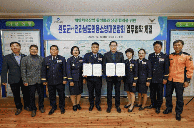 협약식은 10일 완도군청에서 진행됐으며, 신우철 완도군수와 정정두 전라남도의용소방대연합회 회장을 비롯한 관계자들이 참석했다.