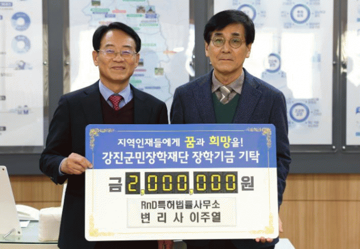 200만원을 기탁한 이주열 변리사는 “고향을 사랑하는 마음과 강진군의 미래를 이끌어갈 후배 양성을 위한 마음으로 장학금을 기탁했다”며 “장학금이 고향 후배들을 위해 잘 사용됐으면 한다”고 밝혔다.