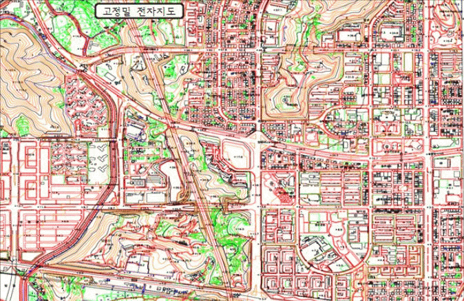 고정밀 전자지도는 1/1,000 대축척 수치지형도를 포함한 각종 지표면, 지하, 수중 및 공간의 위치와 지형·지물 및 지명 등의 각종 지형공간정보를 기호나 문자 등으로 표시한 3차원 공간정보 데이터를 전산화 한 지도다.