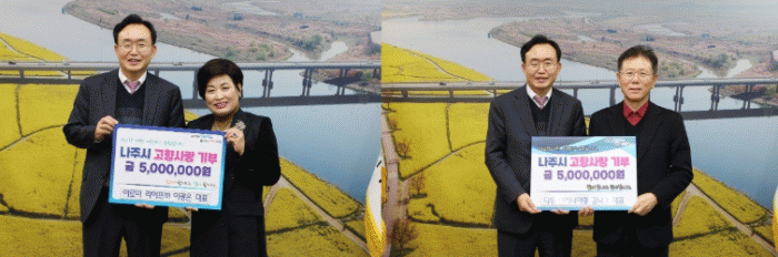 윤병태 나주시장은 “나주에 터를 잡은 기업들이 더욱 성장할 수 있도록 제도적 개선과 상급 기관 협의를 지속하겠다”며 “두 기업 대표님의 따뜻한 기부에 감사드리며 고향사랑기부제를 통해 지역사회에 더 많은 관심과 참여가 이어지길 기대한다”고 말했다.