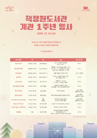개관 1주년 행사는 북 토크, 음악회, 독서 이벤트 등 주민들과 함께 축하하며 즐기는 자리로 꾸려질 예정이다.