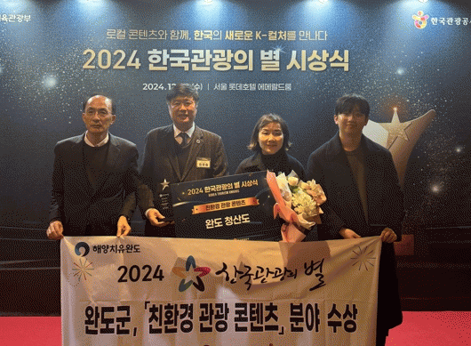 군 관계자에 따르면 지난 18일 롯데호텔 서울에서 개최된 한국관광공사 주관 ‘2024 한국 관광의 별’ 시상식에서 완도 청산도가 올해 환국 관광을 빛낸 친환경 관광 콘텐츠 분야에서 본상을 수상했다고 전했다.