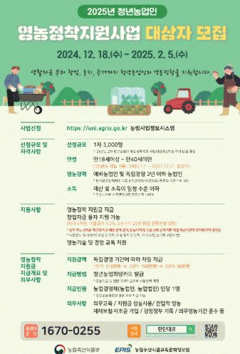 후계농업경영인 지원사업은 만 18세 이상부터 만 50세 미만으로 영농에 종사한 적이 없거나 경력 10년 미만인 농업인으로, 농지 구입, 가공시설 설치, 축사 신축 등 다양한 용도로 활용할 수 있는 국고 융자금을 5억 원을 지원한다.