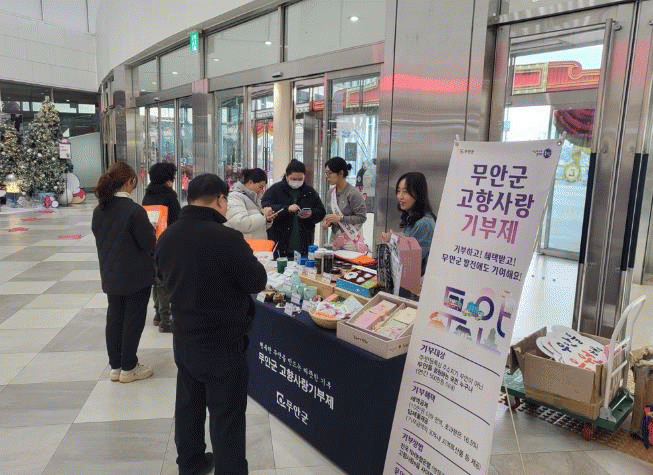 크리스마스를 앞두고 선물을 구입하기 위해 남악 롯데아울렛을 찾는 방문객이 늘어남에 따라, 군은 이들을 대상으로 무안군 답례품과 기금사업을 소개하고 고향사랑기부제 홍보물을 배부했다.