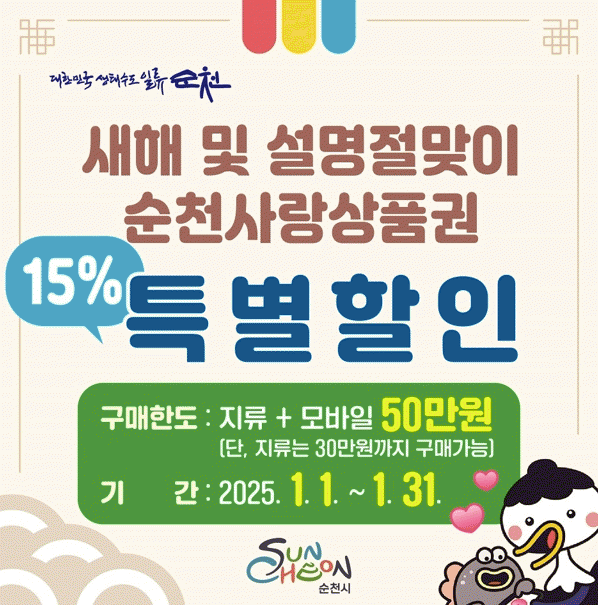 노관규 순천시장은 “이번 특별할인 판매가 어려운 시기에 새해와 설 명절을 맞이하는 소상공인과 시민 모두의 경제활동에 적게나마 도움이 되기를 바란다”고 전했다.