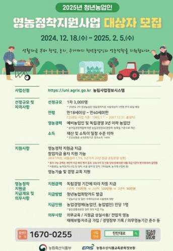 단, 사업 선정 대상자는 영농기간 준수, 의무교육과정 이수, 재해보험 가입 등 의무사항에 대해 철저히 이행해야 하며 영농정착 지원금 지급 완료 후에도 지원받은 기간만큼 전업적 영농을 유지해야 한다.