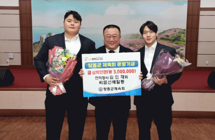 이 밖에도 유양곤 장흥군합기도협회장, 김인아 컴포즈장흥점 대표, 김재명 강동식육점 대표, 문준석·문형석 수원시청씨름단 선수, 마권수 연수구청씨름단 선수, 김영래 ㈜삼성엘리베이터 대표가 기부에 동참했다.