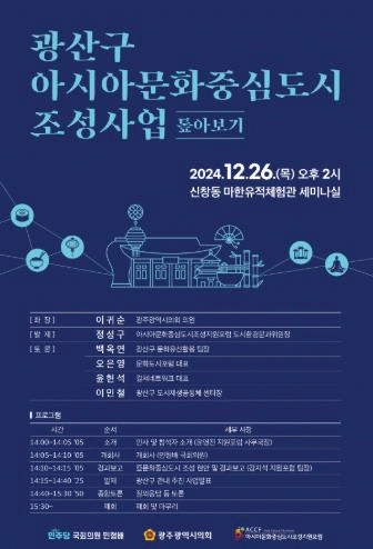 이번 정책토론회에서는 문화체육관광위원회 민형배 국회의원의 개회사를 시작으로 아시아문화중심도시조성사업 현안 등 경과보고와 광산구 관련 주요 사업에 대해서 발표와 토론이 진행된다.