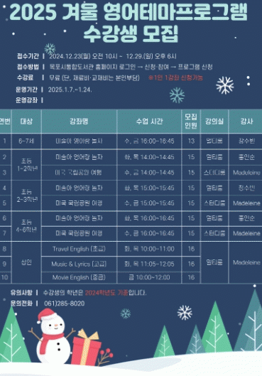 수강자는 오는 29일까지 목포시통합도서관 누리집에서 선착순 모집하며, 접수 방법 등 기타 자세한 내용은 누리집(도서관이용→공지사항)를 참고하면 된다.