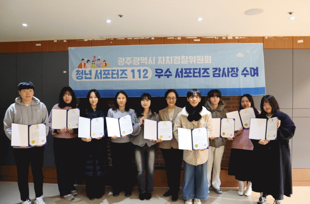 ‘청년 서포터즈 112’는 자치경찰 분야 온라인 홍보와 지역 맞춤형 치안시책 발굴을 위해 블로그?페이스북?인스타그램?카카오톡 등 개인 사회관계망서비스(SNS)를 보유하고 있는 19세 이상 39세 이하 광주시민을 대상으로 매년 2회 모집, 운영하고 있다.