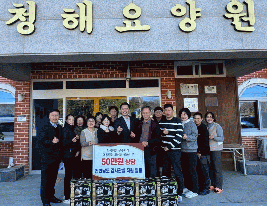 전남도 감사관실 직원들은 24일 완도의 청해요양원과 고금요양원을 찾아 포상금으로 화장지, 세제, 과일 등 100만 원 상당의 생필품을 구입해 기부하고 지역 어르신들의 말벗이 돼줬다.