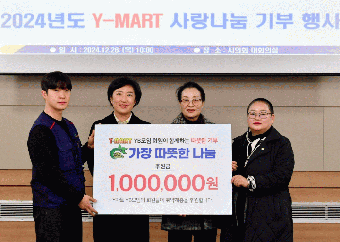 시의회에 따르면 ‘Y-MART YB모임회(회장 김찬혁)’에서 주변의 어려운 이웃들이 따뜻한 연말을 보내길 기원하며, 시의회 및 자치구 의회에서 연계해준 사회복지단체에 Y-MART 모든 점포에서 사용할 수 있는 상품권 500만원 상당을 전달했다.