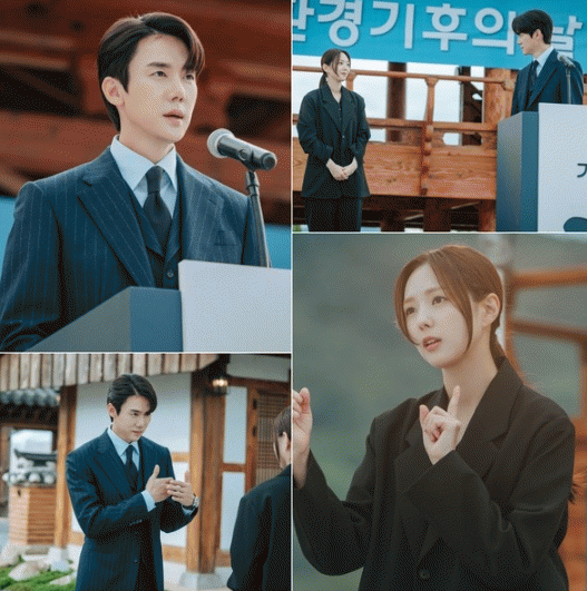 희주는 꿈에만 그리던 사언과의 연설에 설레하며 본인이 맡은 임무에 최선을 다한다. 비밀스럽게 서로를 바라보는 두 사람의 눈맞춤이 미소를 자아내는 상황. ‘능력 부부’ 사언과 희주는 공식 일정을 무사히 마칠 수 있을지 궁금해진다.
