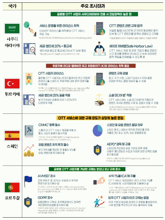이번 2024년 해외 OTT 시장조사는 사우디아라비아, 튀르키예, 스페인, 포르투갈의 글로벌·로컬 OTT 사업자, 법률 및 유관산업 전문가 등을 대상으로 현지 전문조사 인력을 활용한 전문가 심층면접조사 등으로 진행됐다.