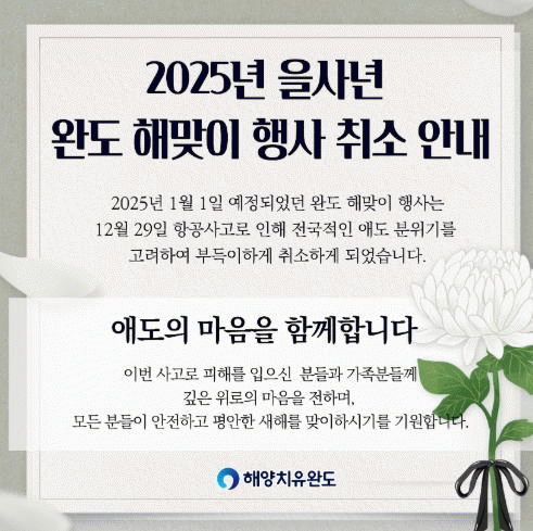 신우철 완도군수는 “항공기 사고에 따른 탑승객분들과 유가족분들에게 깊은 애도와 위로의 마음을 표한다”라며 “해맞이 행사는 취소됐지만 혹시 모를 방문객들을 대비하여 안전 관리에 만전을 기하겠다”라고 밝혔다.