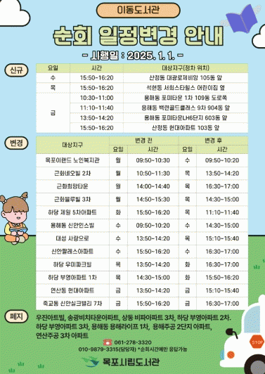 목포시립도서관 관계자는 “이동도서관 순회일정 변경을 통해 시민들이 책과 더욱 가까워지는 계기가 되길 바라며 많은 관심과 이용 바란다”고 말했다.
