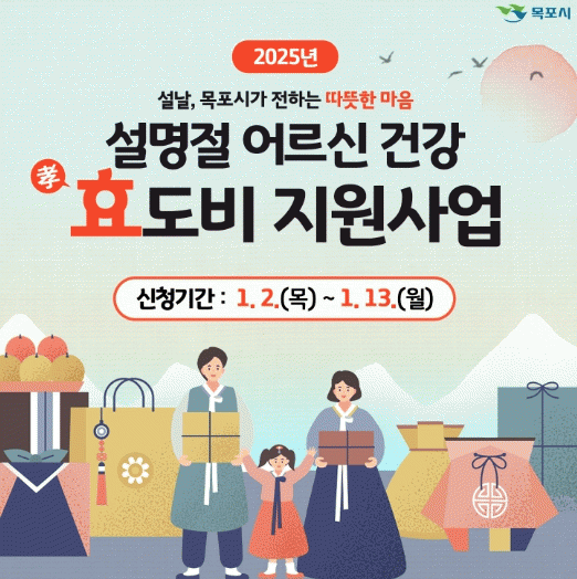 어르신 건강효도비 지원 대상 가구는 80세이상 효도 대상자와 함께 목포시에 동일세대로 6개월이상 주민등록이 되어 실제 거주하는 3대(代)이상 가정으로 2025년 설 명절에 100,000원을 지원한다.