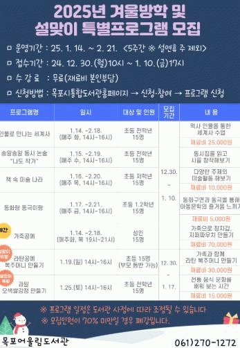 시 관계자는 “목포어울림도서관이 준비한 겨울방학 및 설맞이 특별프로그램을 통해 지역주민의 적극적인 평생학습 활동에 기여할 수 있기를 바란다”고 말했다.