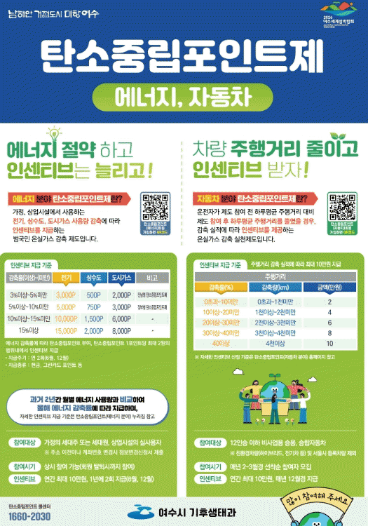 한편, 여수시는 자동차 탄소중립포인트제를 통해 주행거리를 감축 운행한 운전자 258명에게 실적에 따라 1천 8백만 원의 인센티브를 지급했다.