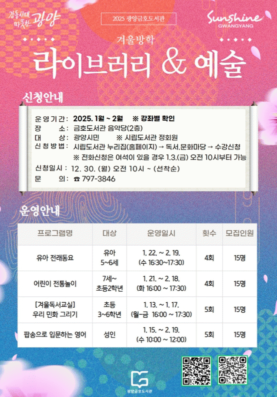 프로그램 수강 신청은 12월 30일 오전 10시부터 광양시립도서관 누리집에서 신청 가능하며 프로그램에 대한 자세한 사항은 광양금호도서관(☎ 797-3846)에 문의하면 된다.