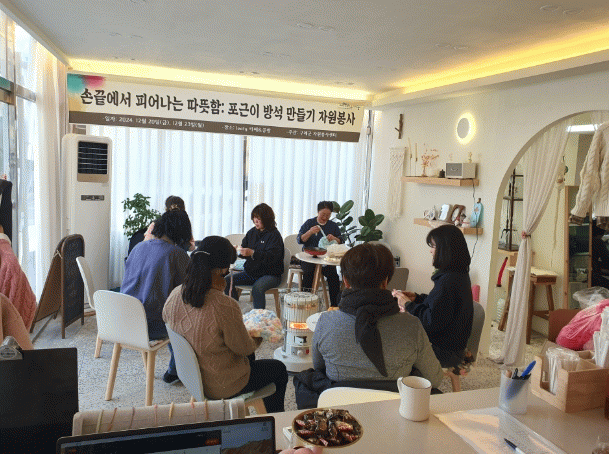 이번 캠페인은 2024년 자원봉사 단체 활성화 지원사업의 일환으로, 관내 루즈공방에서 청키실을 활용해 방석을 제작하고 이를 지역 내 경로당에 전달하는 형태로 진행됐다.