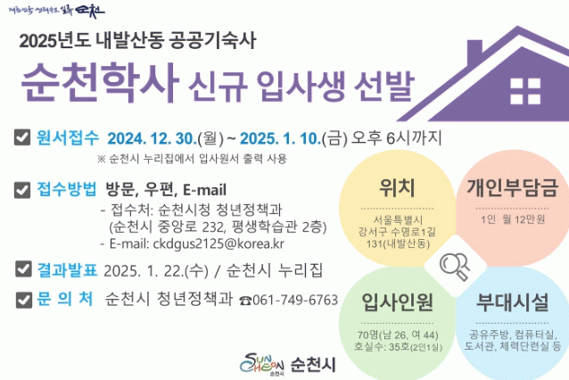 순천학사 입사서류는 순천시 청년정책과로 방문, 등기우편 또는 이메일을 통해 오는 10일 오후 6시까지 제출해야 하며, 최종합격자는 오는 22일에 발표될 예정이다.