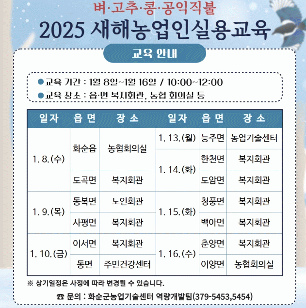 교육 장소는 읍·면 복지회관, 농협 회의실, 농업기술센터 등으로 13개 읍·면별 집합교육으로 진행되며, 화순군민이면 누구나 사전 신청 없이 참여할 수 있다.