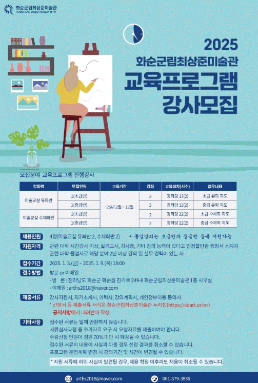 문의 사항은 화순군립최상준미술관에 문의하면 된다.