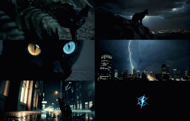 먼저 리더 필름 영상에는 검은 고양이가 비 내리는 숲속에서 걸어 나와 천둥 치는 도시 한복판에 멈춰서는 모습이 담겼다.