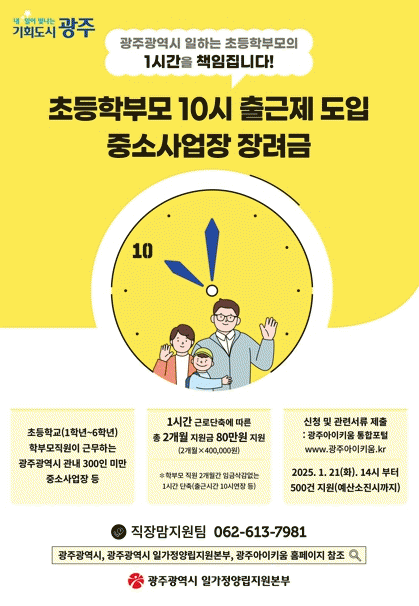 광주광역시는 ‘지각장려금’으로 불리며 출·퇴근 시간을 1시간 조정할 수 있는 ‘초등학부모 10시 출근제’에 참여할 사업장을 모집한다.