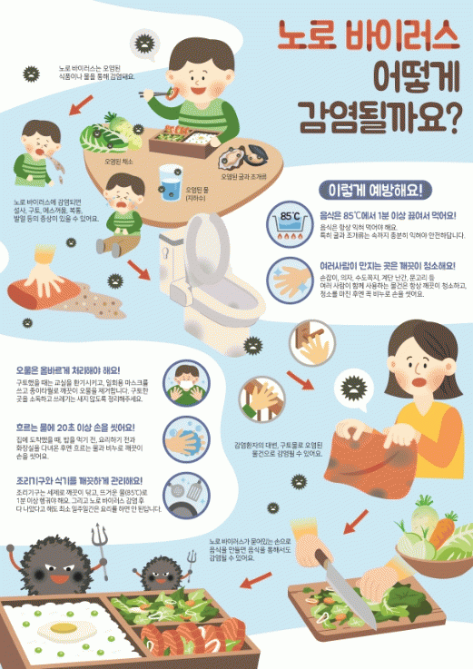 노로바이러스는 감염 시 1~3일간 구토와 설사, 복통 및 발열과 탈수증상을 일으키며 낮은 온도에도 생존해 겨울철 유행하는 수인성·식품 매개 감영병이다.