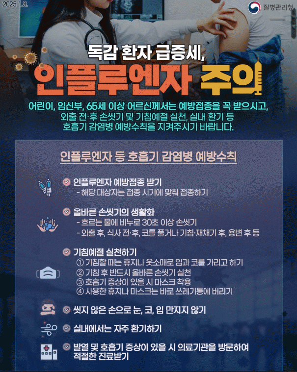 또한 지난해 12월 20일 유행주의보가 발령됨에 따라 고위험군 환자는 항바이러스제 건강보험 급여가 적용되므로, 가까운 의료기관을 방문해 초기에 적극적인 치료를 받는 것이 필요하다.