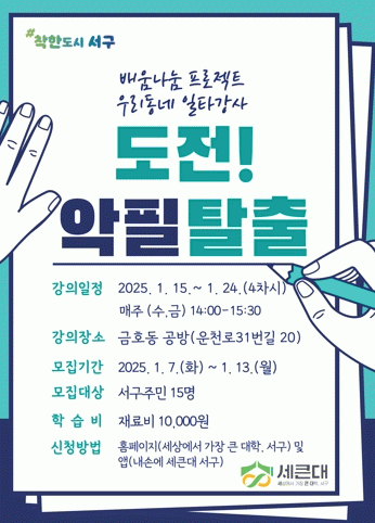 수강 신청은 7일부터 13일까지 서구 온라인 플랫폼인 ‘세상에서 가장 큰 대학, 서구’홈페이지와 모바일 앱 “내손에 세큰대서구”를 통해 선착순으로 접수받는다. 자세한 사항은 서구청 세상에서 가장 큰 대학팀으로 문의하면 된다.