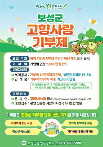 이러한 목표 달성을 위해 보성군은 지자체 간 교차 기부, 각종 행사 참여 홍보, 가을맞이 및 연말 이벤트 등 다양한 방법으로 기부 참여를 유도했다.
