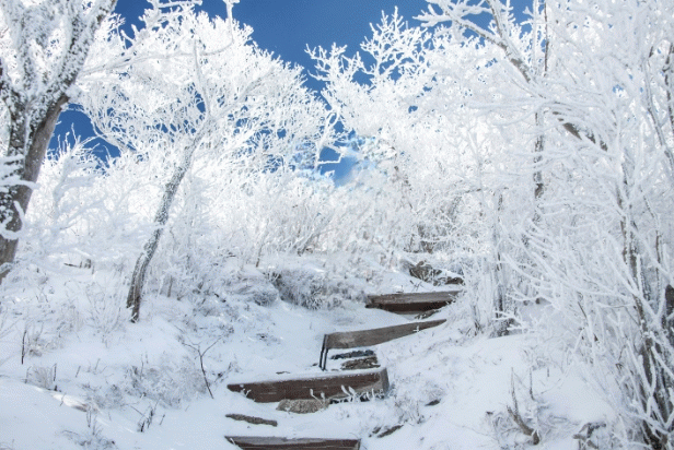 백운산은 사시사철 수려하지만, 은빛으로 빛나는 상고대가 눈꽃 터널을 이루는 겨울은 한층 매혹적인 장관을 뽐낸다.
