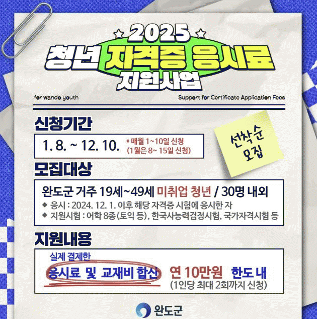 지원 대상은 신청일 기준 완도군에 주소를 둔 19세~49세 미취업 청년으로, 2024년 12월 1일 이후 어학(8종), 한국사, 국가 자격증(국가 기술 자격증, 국가 전문 자격증)을 실제로 응시한 청년이면 누구나 신청할 수 있다.