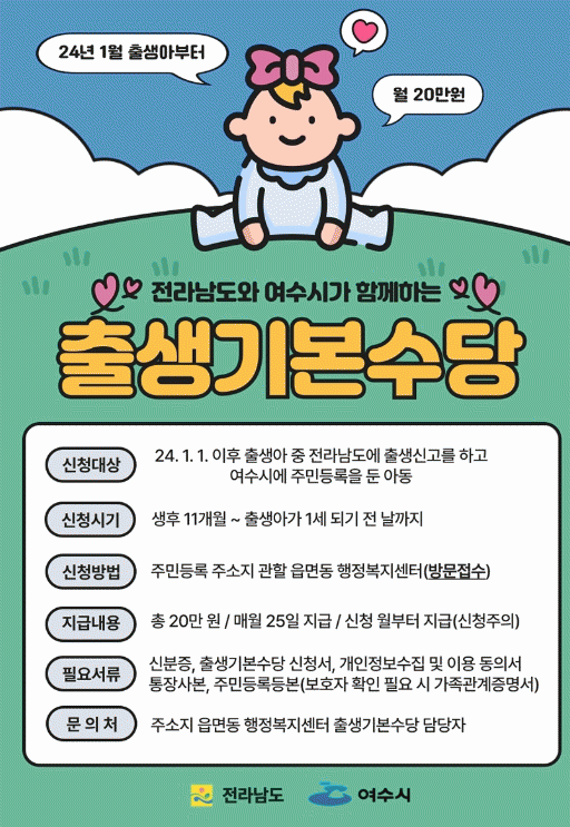 지급 대상은 2024년 1월 1일 이후 출생아 중 전라남도에 출생신고를 하고, 출생아와 보호자 중 1명이 여수시에 주민등록을 두고 거주 중인 가구다.