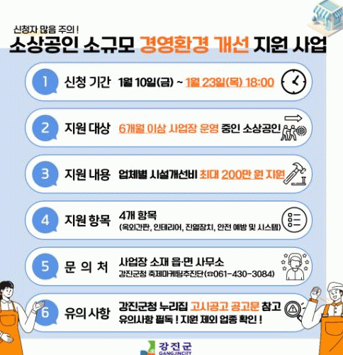 기타 문의사항은 강진군 소상공인 소규모 경영환경 개선 지원사업 담당자로 문의하면 된다.