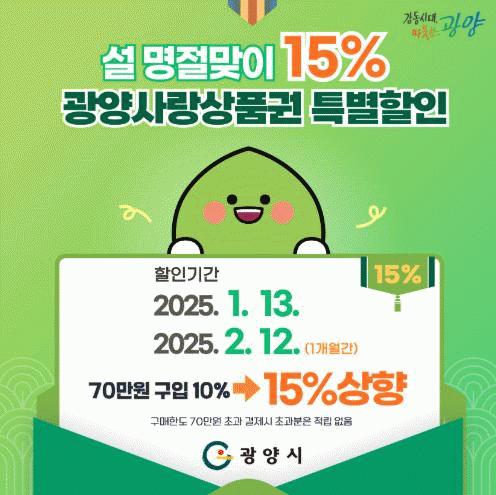 설 명절맞이 소비 진작 이벤트 기간에는 광양사랑상품권 할인율이 15%로 상향 조정된다.