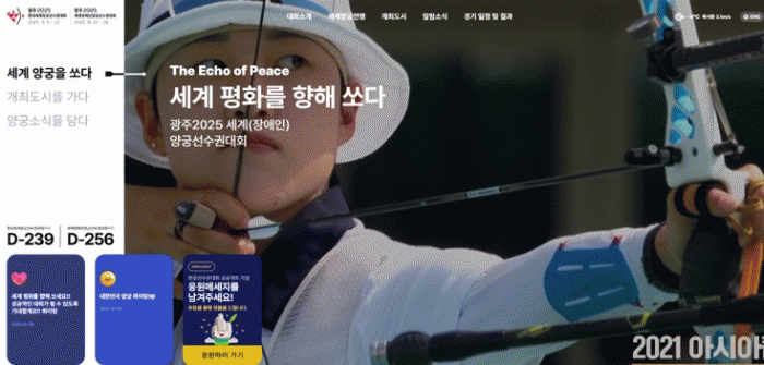 누리집은 ▲대회 소개 ▲세계양궁연맹 ▲개최도시 ▲알림소식 ▲경기일정 및 결과 등 5개 메뉴로 구성, 한눈에 대회 정보를 확인할 수 있도록 했다.