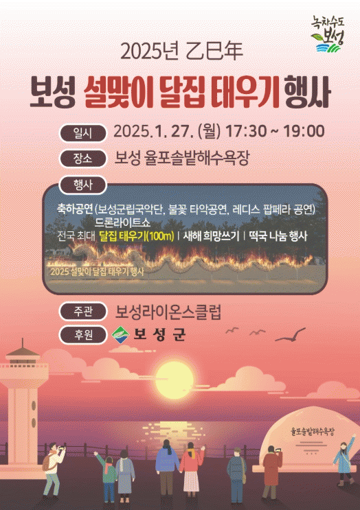 행사는 오후 5시 30분 보성군립국악단과 그룹 레디스의 팝페라 축하공연으로 시작된다. 이어지는 해넘이 시간에는 불꽃 타악 공연이 펼쳐져 관객들에게 시각과 청각의 즐거움을 선사할 계획이다.