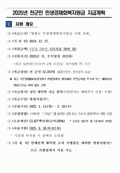 금년 1월 말에 설 명절이 있어 1차분 지원금은 1월 13일부터 신청을 받고 있으며 신청일로부터 1 부터 2일이내에 영광사랑카드에 지급된다.
