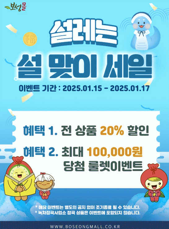 이번 할인행사는‘보성몰’을 이용하는 모든 고객을 대상으로 20% 할인(일부 품목 제외), 룰렛 이벤트(2천 부터 10만 포인트 적립) 등 설레는 설 명절을 맞이해 특별한 혜택이 제공된다.