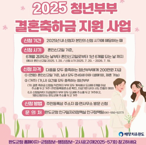 완도군은 지난해 청년 부부 결혼 축하금으로 77쌍의 부부에게 1억 5천4백만 원, 신혼부부 주거 비용 대출 이자 지원으로 7쌍의 부부에게 1천4백만 원을 지원한 바 있다.