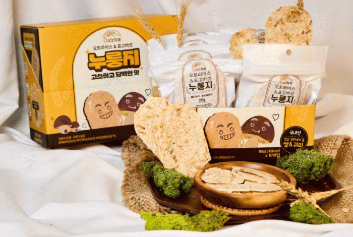 ‘오트라이스 표고누룽지칩’은 국내산 쌀과 표고버섯을 주원료로 만들어져 고소하고 바삭한 식감을 자랑하는 간식이다.
