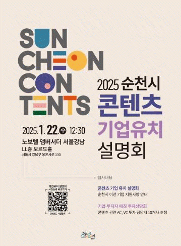 설명회는 순천시 콘텐츠산업 생태계 소개, 이전기업 우수사례 발표, 콘텐츠 관련 투자사 우수사례 발표 순으로 진행되며 별도의 투자 상담부스를 운영하여 기업과 투자사를 1:1 매칭해 기업별 맞춤형 투자 상담회도 진행할 예정이다.